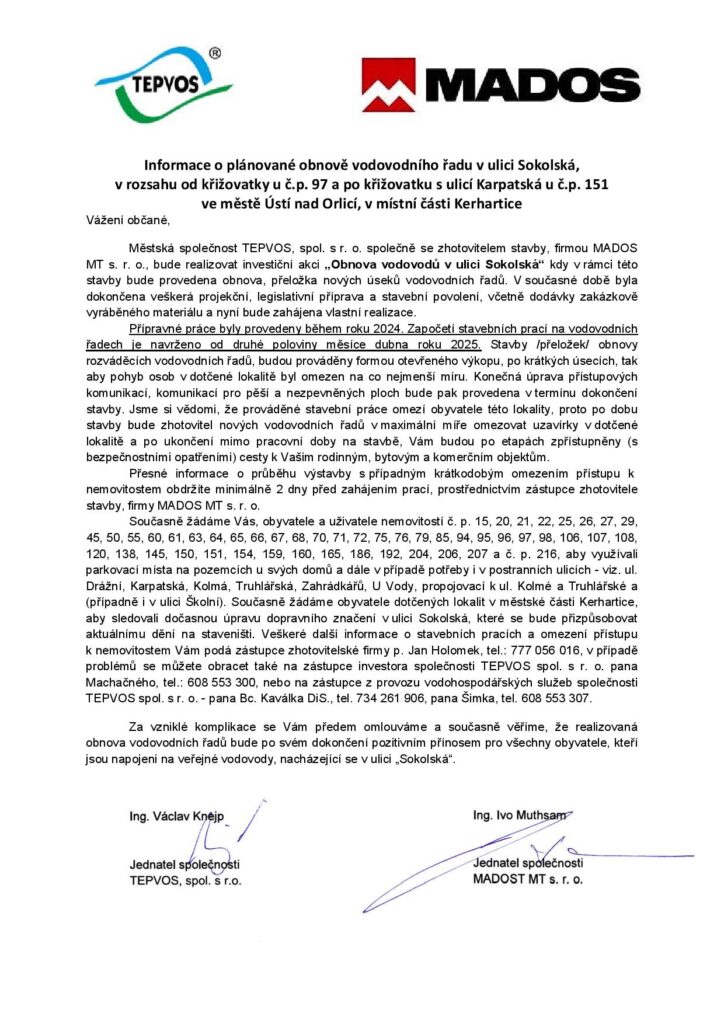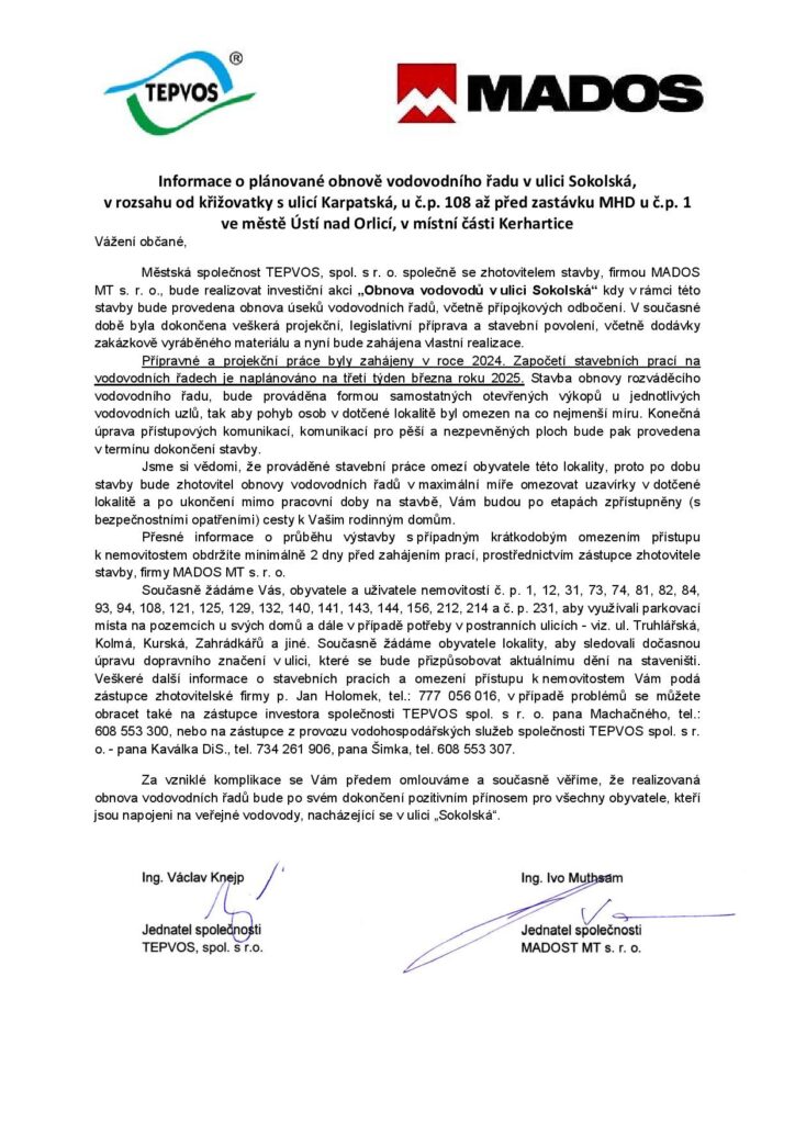 Městská společnost TEPVOS, spol. s r. o., ve spolupráci se zhotovitelem stavby, firmou MADOS MT s. r. o., zahájí v nejbližších dnech realizaci investiční akce „Obnova vodovodů v ulici Sokolská“ v místní části Kerhartice, Ústí nad Orlicí. Cílem projektu je obnova vodovodních řadů v několika úsecích této ulice, a to v rozsahu od křižovatky u č.p. 97 po křižovatku s ulicí Karpatská u č.p. 151, a od křižovatky s ulicí Karpatská u č.p. 108 až před zastávku MHD u č.p. 1.